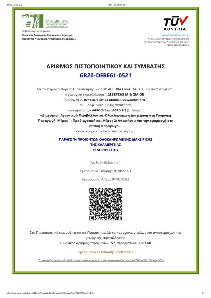 11 Οκτωβρίου, 2021Ολοκληρώθηκε με επιτυχία η παράδοση των ποσοτήτων σκληρού σίτου της ποικιλίας MAESTA’ με ιδιαίτερη επιτυχία και εξαιρετικά ποιοτικά χαρακτηρηστικά Η όλη διαδικασία έγινε με ολοκληρωμένη διαχείρηση με την έγριση της TUV AUSTRIA